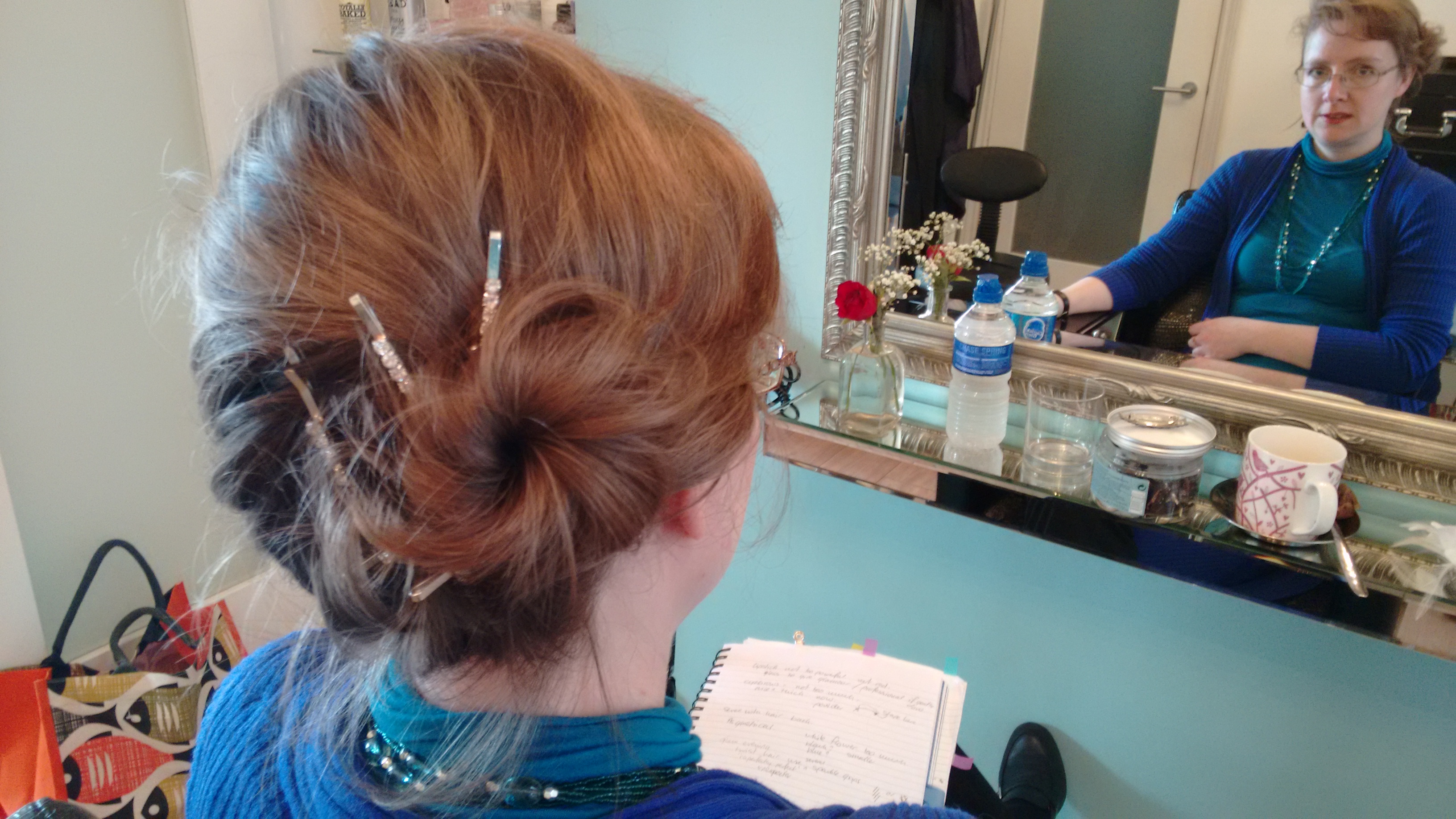 In a break between playing with makeup and colours, Maria played with my hair as well. I’m accustomed to dealing with my daughter’s long hair, and my own, when it was longer in my teens and twenties, but now I tend to wash it, let it dry naturally, and have it the same every day. I’ll be back for another hair appointment later (and another blog), but Maria showed me how to scoop my shoulder-length, wavy hair into a series of glamourous evening looks, with clips I already own. I may need to go shopping for more, as it did look rather good!