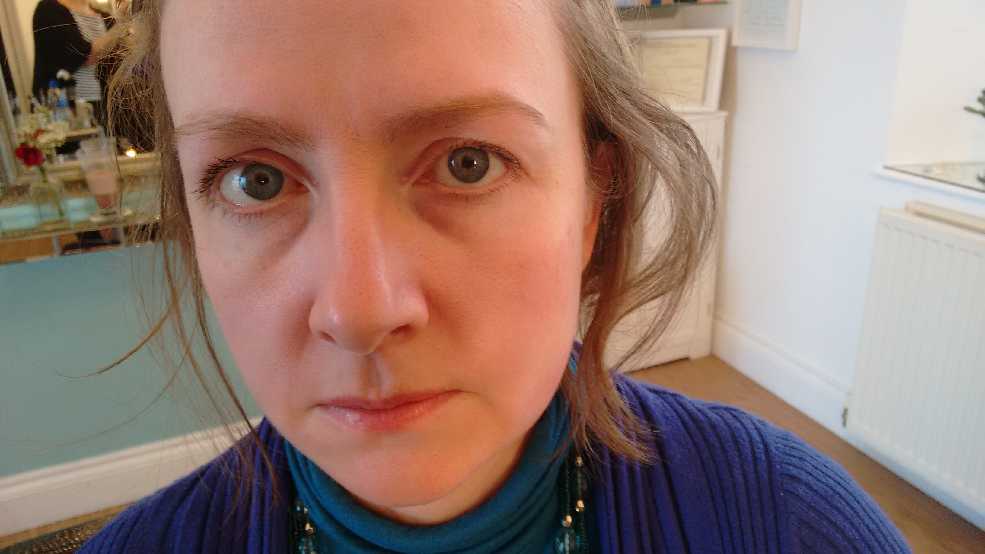 Maria applied a light foundation, explaining the steps she took as she went, as well as telling me what not to do. As someone who never wears foundation, this was very instructive, and I couldn’t believe how much better the blotchiness on my skin appeared, with even the lightest of coverings. It didn’t look trowelled on, at all, and was virtually invisible.