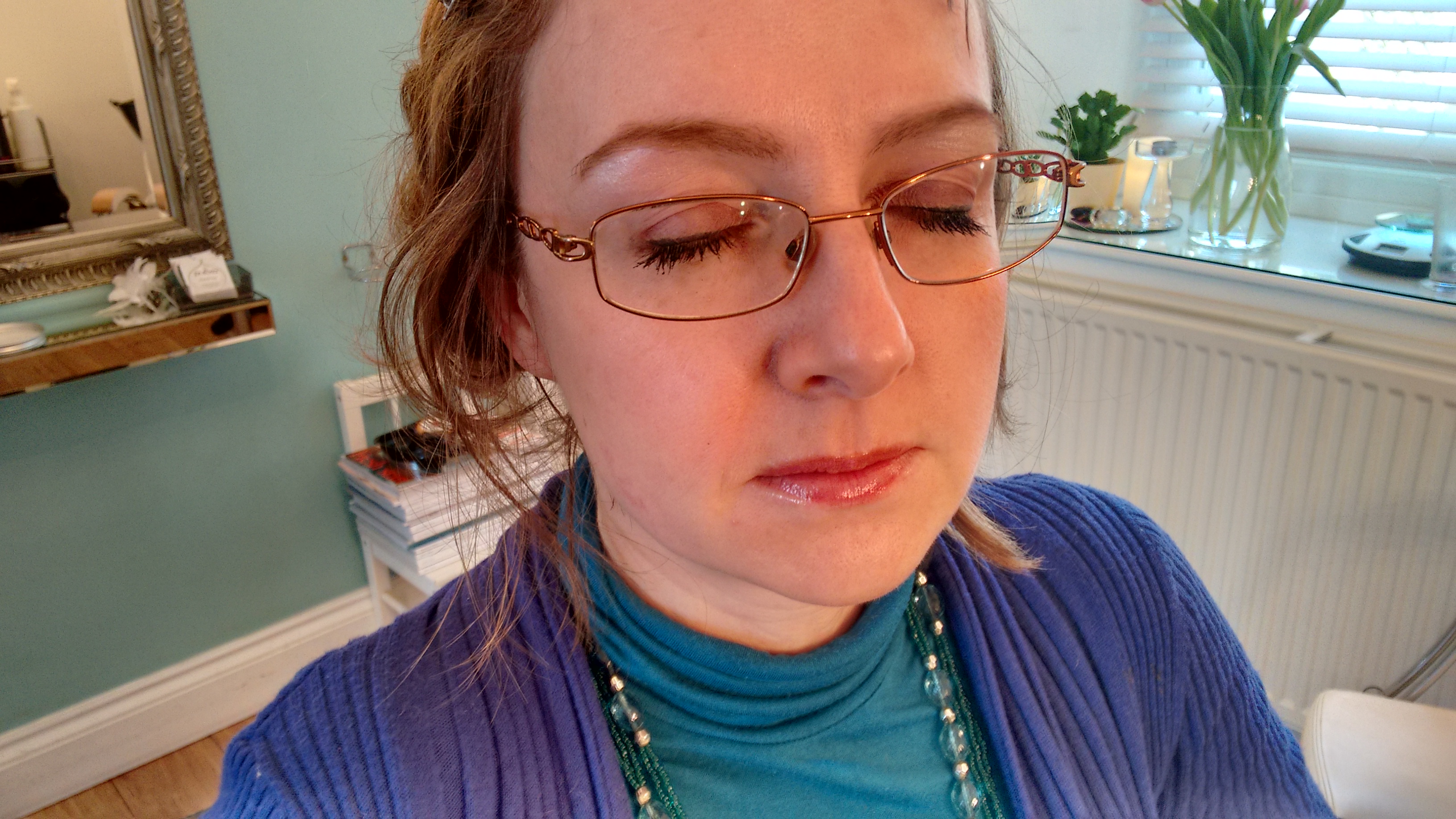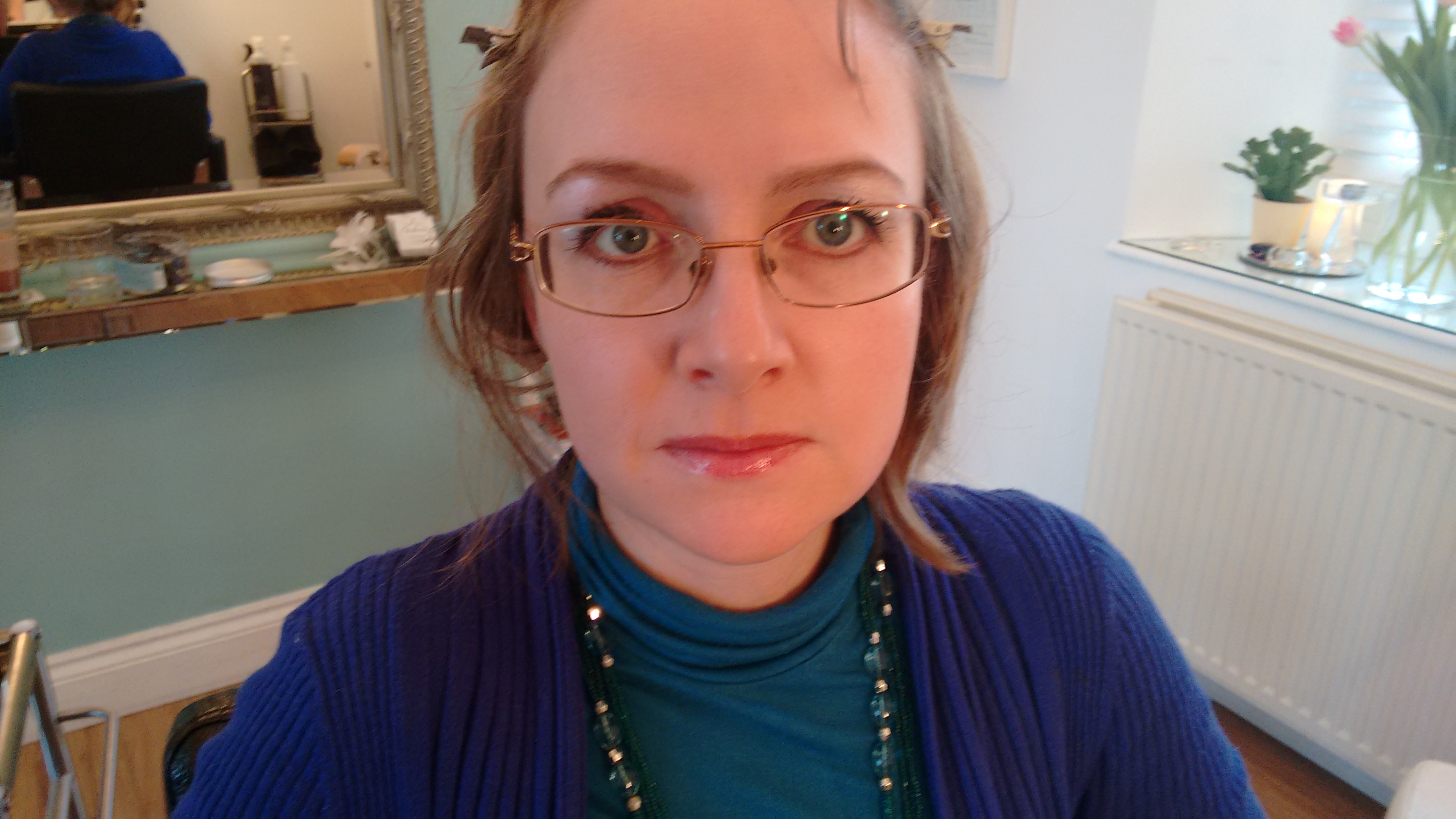 The shape of my eyes is slightly altered by the glasses, and the way they sit across my face, and Maria showed me how to use eyeliner of different colours, eyeshadow and mascara, to balance the effect of the glasses, open my eyes up, and make them the focal point of my face. From comments afterwards, they were definitely more obvious, and my natural blue colour stood out more.