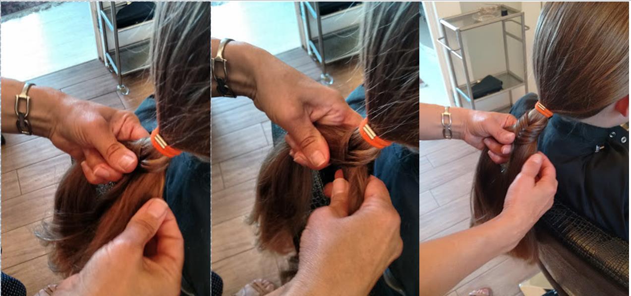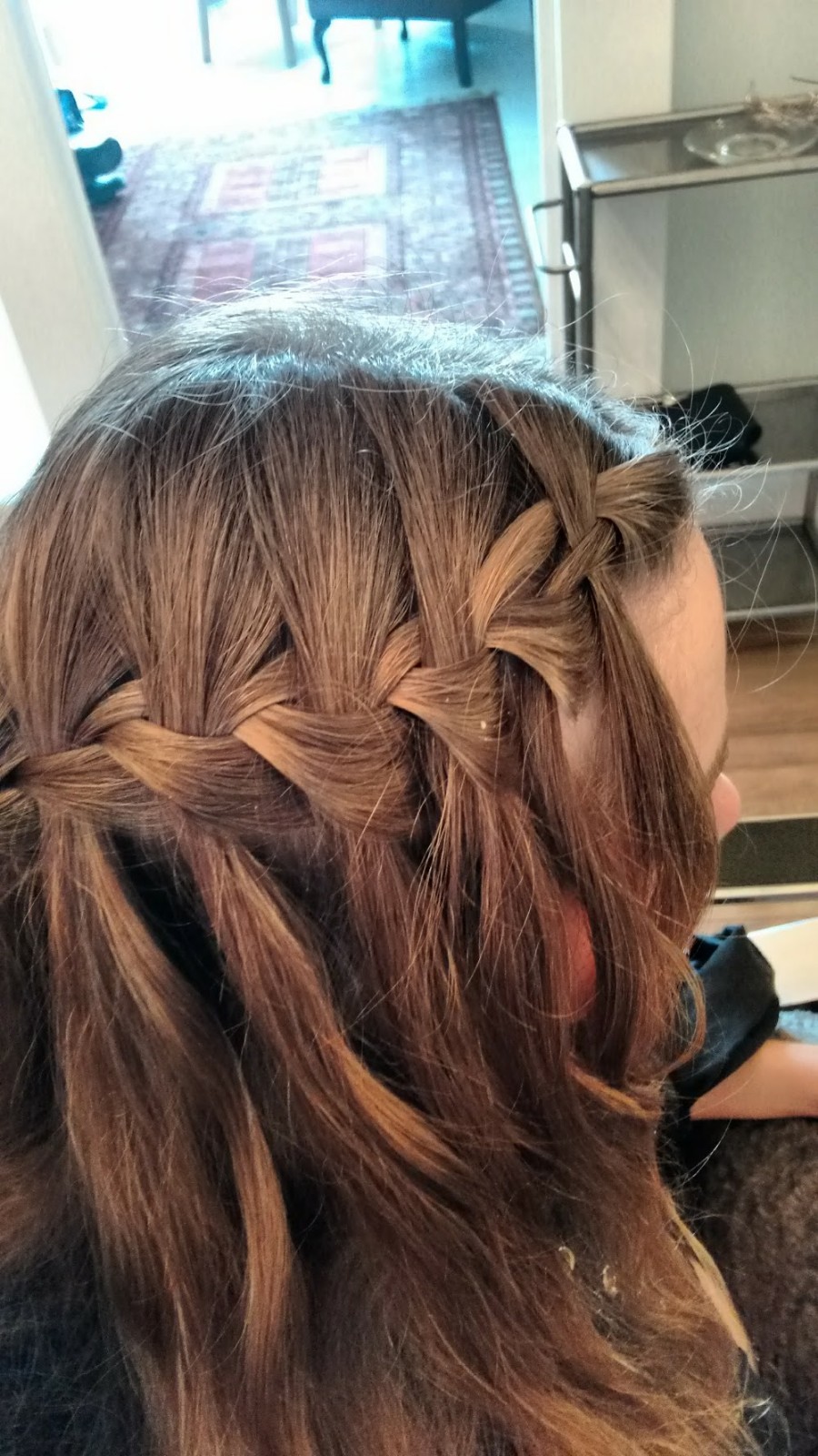 With a waterfall plait, you take the hair in from the top, losing the hair from the bottom, and then collecting a new strand from the bottom. Effectively, hair strands fall straight through, in a straight line, if you’re getting it right.