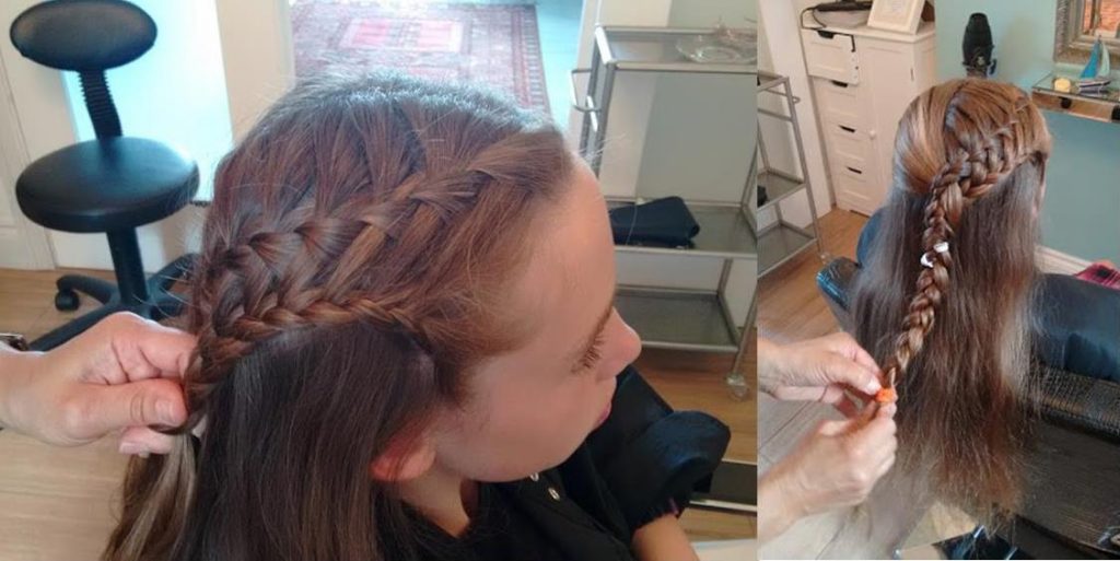 Maria began by explaining that once you know how to plait, any plait is actually quite straight forward. She demonstrated this by creating a crown, more or less, on my daughter’s head, simply winding a French plait around and around, until all the hair was incorporated, and the whole head was covered. Very impressive.